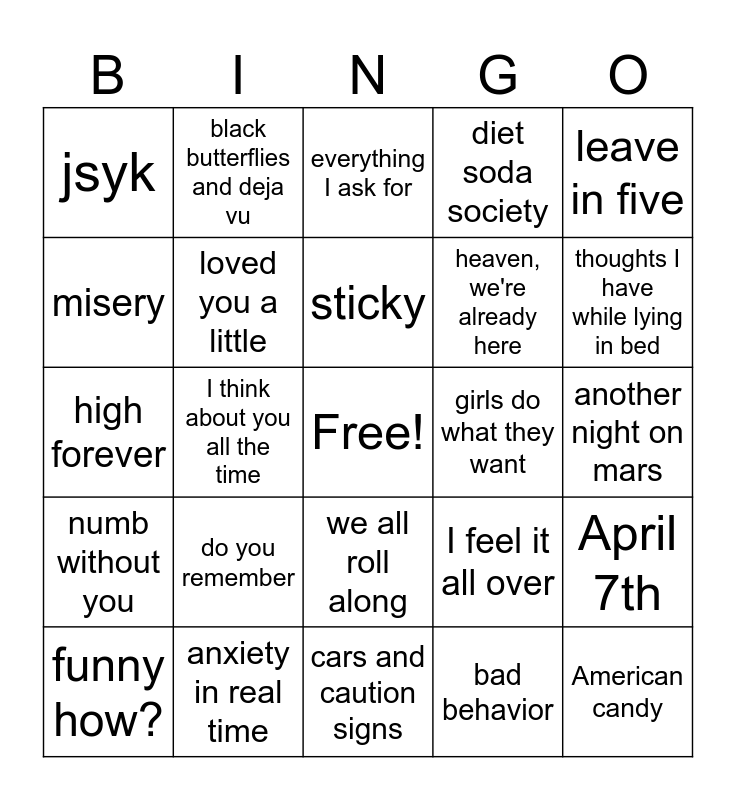 This bingo card has a free space and 37 words: dirty, pretty, beautiful, blame, dose no. 2, loved you a little, April 7th, do you remember, sticky, my best habit, leave in five, how to exit a room, I think about you all the time, diet soda society, American candy, another night on mars, misery, numb without you, am I pretty?, everything I ask for, we all roll along, girls do what they want, jsyk, thoughts I have while lying in bed, funny how?, cars and caution signs, spiraling, bad behavior, black butterflies and deja vu, taxi, how do you feel?, lips, pretender, anxiety in real time, high forever, slip the noose, I feel it all over, heaven, we're already here and shinju.