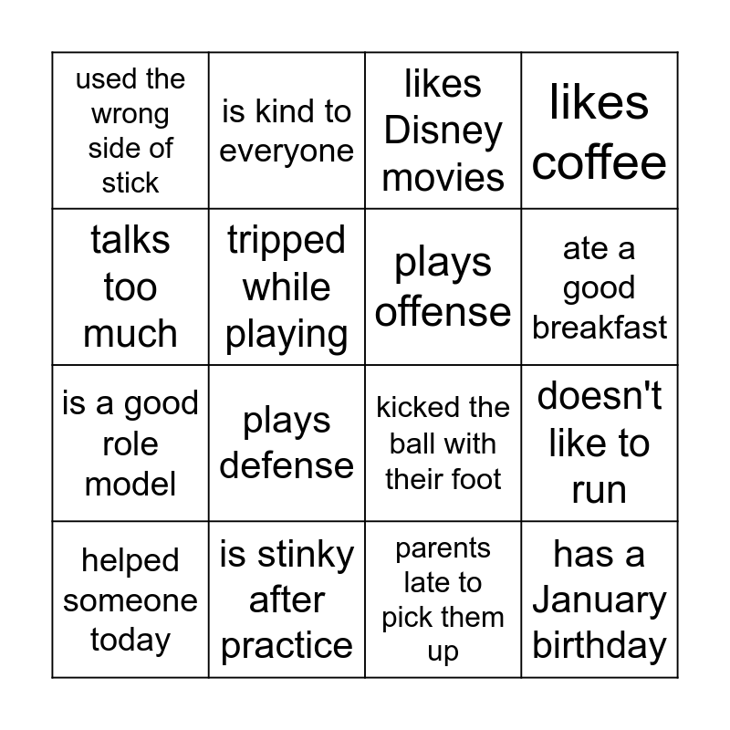 This bingo card has 16 words: is stinky after practice, doesn't like to run, likes Disney movies, used the wrong side of stick, is a good role model, is kind to everyone, kicked the ball with their foot, parents late to pick them up, talks too much, tripped while playing, helped someone today, likes coffee, plays defense, ate a good breakfast, plays offense and has a January birthday.