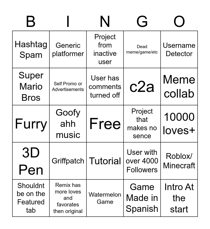This bingo card has a free space and 24 words: Griffpatch, Remix has more loves and favorates then original, User has comments turned off, Shouldnt be on the Featured tab, Username Detector, Hashtag Spam, Super Mario Bros, Generic platformer, Project that makes no sence, Tutorial, c2a, Furry, User with over 4000 Followers, Roblox/ Minecraft, Self Promo or Advertisements, Game Made in Spanish, 10000 loves+, Project from inactive user, Meme collab, Goofy ahh music, Intro At the start, 3D Pen, Dead meme/game/etc and Watermelon Game.
