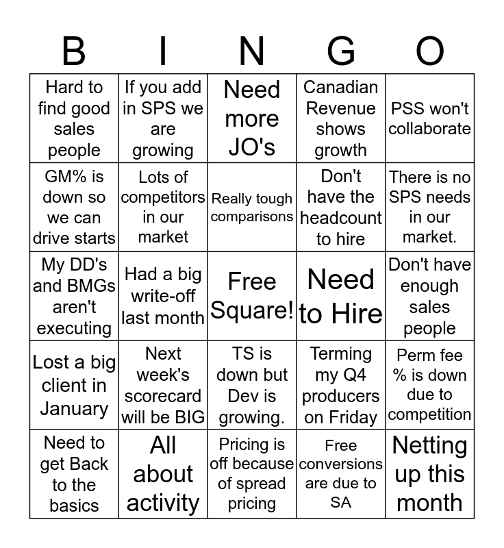 This bingo card has a free space and 24 words: Next week's scorecard will be BIG, All about activity, Really tough comparisons, Need to get Back to the basics, PSS won't collaborate, Hard to find good sales people, GM% is down so we can drive starts, If you add in SPS we are growing, Need to Hire, TS is down but Dev is growing., Don't have the headcount to hire, My DD's and BMGs aren't executing, Terming my Q4 producers on Friday, Perm fee % is down due to competition, Lots of competitors in our market, Free conversions are due to SA, Don't have enough sales people, Need more JO's, There is no SPS needs in our market., Had a big write-off last month, Netting up this month, Lost a big client in January, Canadian Revenue shows growth and Pricing is off because of spread pricing.
