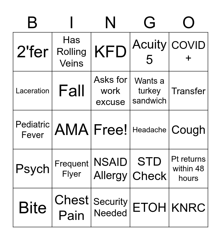 This bingo card has a free space and 24 words: Frequent Flyer, Chest Pain, Asks for work excuse, Bite, COVID +, 2'fer, Laceration, Has Rolling Veins, Headache, NSAID Allergy, Wants a turkey sandwich, Pediatric Fever, STD Check, Pt returns within 48 hours, Fall, ETOH, Cough, KFD, Transfer, AMA, KNRC, Psych, Acuity 5 and Security Needed.