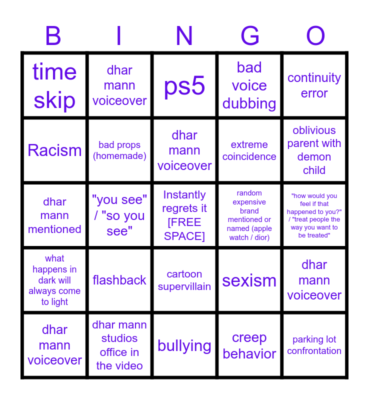 This bingo card has a free space and 29 words: dhar mann voiceover, dhar car, "you see" / "so you see", merch in video, time skip, ps5, bad props (homemade), flashback, random expensive brand mentioned or named (apple watch / dior), dhar mann studios office in the video, "how would you feel if that happened to you?" / "treat people the way you want to be treated", parking lot confrontation, bullying, creep behavior, oblivious parent with demon child, kids with ipad, cartoon supervillain, what happens in dark will always come to light, continuity error, dhar mann mentioned, sexism, someone fired over something small, extreme coincidence, Racism, bad voice dubbing, dhar mann voiceover, dhar mann voiceover, dhar mann voiceover and dhar mann voiceover.