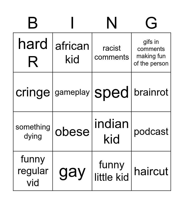 This bingo card has 16 words: gay, podcast, racist comments, hard R, something dying, african kid, indian kid, funny little kid, cringe, gameplay, funny regular vid, gifs in comments making fun of the person, obese, brainrot, sped and haircut.