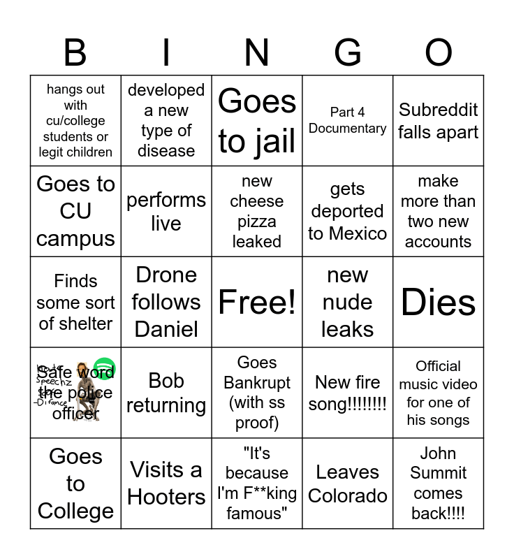This bingo card has 1 images, a free space and 24 words: Bob returning, Visits a Hooters, new cheese pizza leaked, Goes to College, Subreddit falls apart, hangs out with cu/college students or legit children, Goes to CU campus, developed a new type of disease, new nude leaks, Goes Bankrupt (with ss proof), gets deported to Mexico, Finds some sort of shelter, New fire song!!!!!!!!, Official music video for one of his songs, performs live, Leaves Colorado, Dies, Goes to jail, make more than two new accounts, Drone follows Daniel, John Summit comes back!!!!, Safe word the police officer, Part 4 Documentary and "It's because I'm F**king famous".