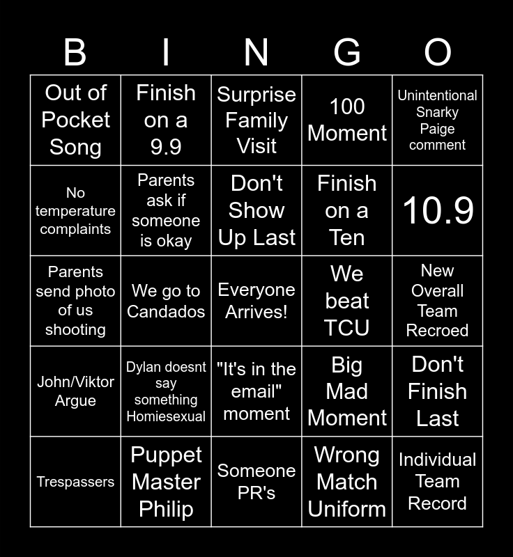 This bingo card has a free space and 29 words: Trespassers, Ammo Dump, We go to Candados, Olivia Screech, Out of Pocket Song, Surprise Family Visit, Parents ask if someone is okay, Dylan doesnt say something Homiesexual, We beat TCU, Puppet Master Philip, New Overall Team Recroed, Individual Team Record, Someone PR's, Wrong Match Uniform, 10.9, 600, "It's in the email" moment, John/Viktor Argue, Unintentional Snarky Paige comment, Parents send photo of us shooting, Big Mad Moment, Tearless Match, Finish on a Ten, No temperature complaints, 100 Moment, Finish on a 9.9, Don't Finish Last, Don't Show Up Last and Don't Be Last Packed Up.