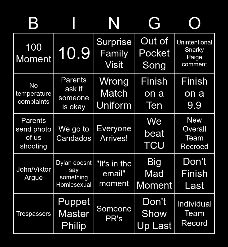 This bingo card has a free space and 29 words: Trespassers, Don't Be Last Packed Up, We go to Candados, Olivia Screech, 100 Moment, Surprise Family Visit, Parents ask if someone is okay, Dylan doesnt say something Homiesexual, We beat TCU, Puppet Master Philip, New Overall Team Recroed, Individual Team Record, Someone PR's, Don't Show Up Last, Finish on a 9.9, 600, "It's in the email" moment, John/Viktor Argue, Unintentional Snarky Paige comment, Parents send photo of us shooting, Big Mad Moment, Tearless Match, Finish on a Ten, No temperature complaints, Out of Pocket Song, 10.9, Don't Finish Last, Wrong Match Uniform and Ammo Dump.