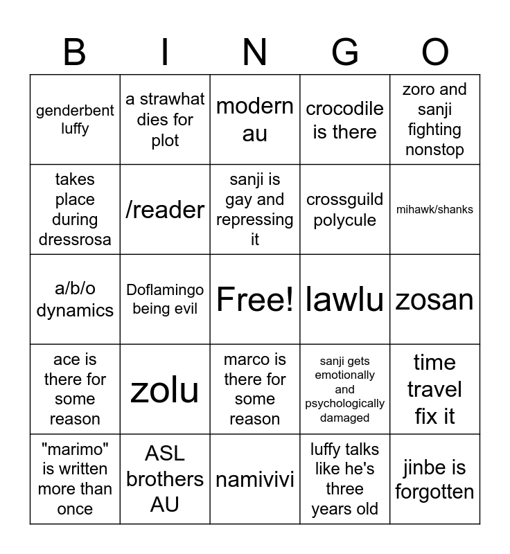This bingo card has a free space and 24 words: zolu, ASL brothers AU, sanji is gay and repressing it, "marimo" is written more than once, zoro and sanji fighting nonstop, genderbent luffy, takes place during dressrosa, a strawhat dies for plot, lawlu, marco is there for some reason, crossguild polycule, a/b/o dynamics, sanji gets emotionally and psychologically damaged, time travel fix it, /reader, luffy talks like he's three years old, zosan, modern au, mihawk/shanks, Doflamingo being evil, jinbe is forgotten, ace is there for some reason, crocodile is there and namivivi.