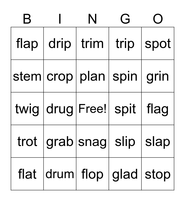 This bingo card has a free space and 36 words: drop, skip, glob, spin, stop, flat, grab, slug, trip, step, trot, drug, crab, flag, twig, drip, flop, spit, grin, flap, drum, plan, slip, frog, blot, crop, trim, twin, spot, stem, plug, snag, glad, slap, fret and sled.