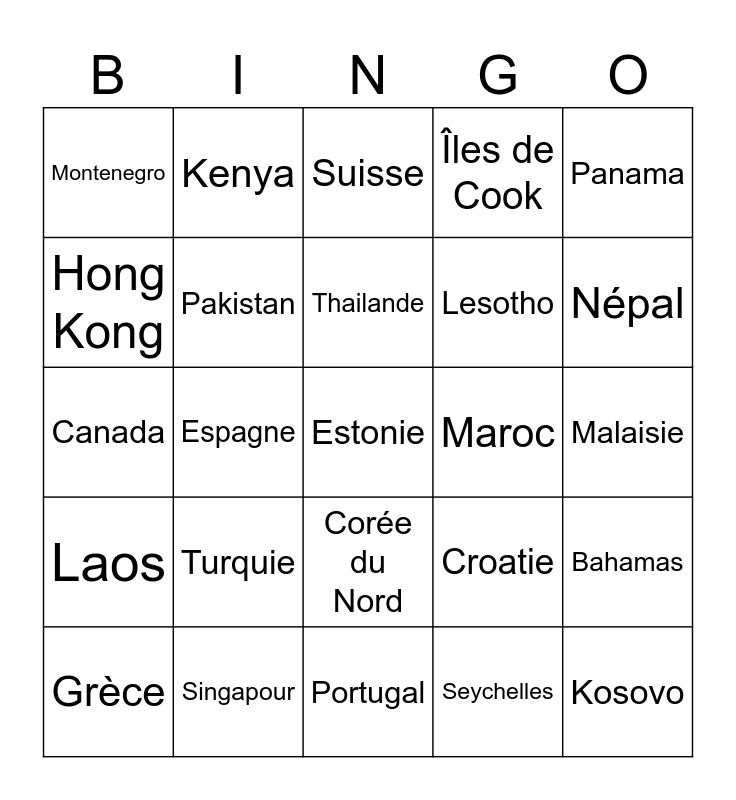 This bingo card has a free space and 24 words: Grèce, Turquie, Thailande, Seychelles, Panama, Montenegro, Kenya, Suisse, Maroc, Malaisie, Canada, Pakistan, Croatie, Bahamas, Hong Kong, Singapour, Portugal, Îles de Cook, Népal, Laos, Espagne, Corée du Nord, Lesotho and Kosovo.