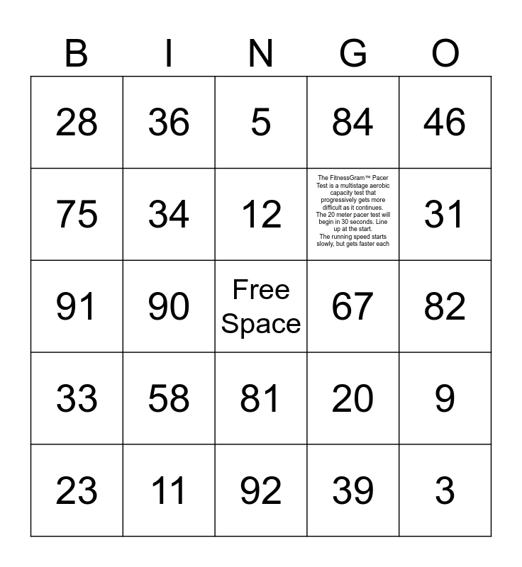 This bingo card has a free space and 24 words: 23, 58, 12, 39, 46, 28, 36, 5, 67, 82, 91, 34, 20, 9, 75, 11, 92, 84, 31, 33, 90, 81, The FitnessGram™ Pacer Test is a multistage aerobic capacity test that progressively gets more difficult as it continues. The 20 meter pacer test will begin in 30 seconds. Line up at the start. The running speed starts slowly, but gets faster each and 3.