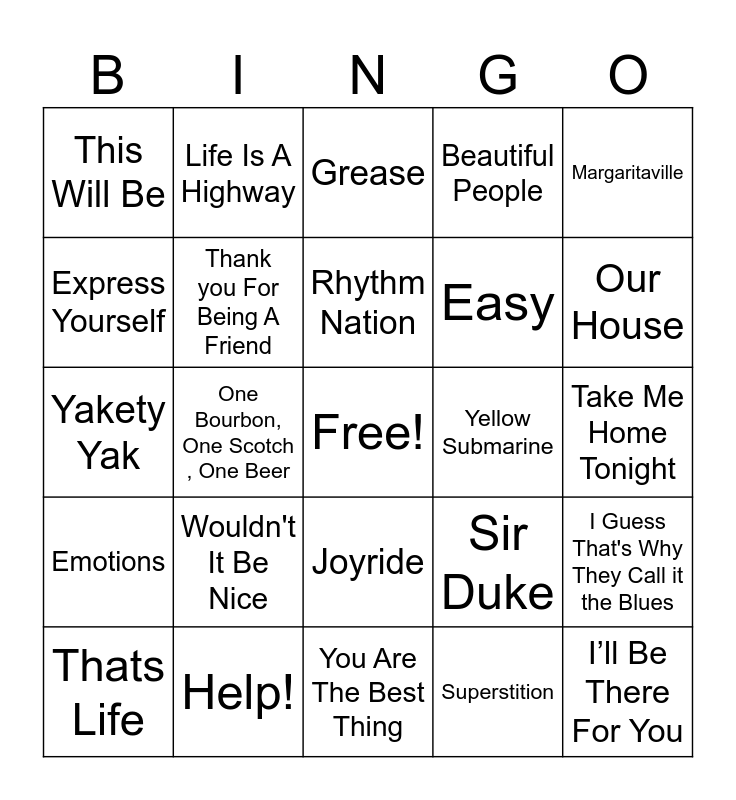 This bingo card has a free space and 56 words: Dinero, Thats Life, Build Me Up ButterCup, This Will Be, You Are The Best Thing, Love Grows, Thank you For Being A Friend, Lovely Day, Easy, Price Tag, Beautiful People, Circles, Dirty Little Secret, Whattaya Want From Me, Chandelier, Holy, Margaritaville, One Bourbon, One Scotch , One Beer, Chattahoochee, I’ll Be There For You, Yellow Submarine, All Together Now, Sir Duke, Grease, Shining Star, Rhythm Nation, Whip It, Brick House, Our House, Bust A Move, Brass Monkey, Put A Little Love In Your Heart, Why Can’t We Be Friends, Lido Shuffle, Take Me Home Tonight, Express Yourself, Yakety Yak, Tennessee Whiskey, Emotions, Life Is A Highway, Joyride, Here Comes The Hotstepper, Smooth, Hook, Blank Space, Wouldn't It Be Nice, Help!, Kokomo, Tiny Dancer, Bennie And The Jets, Superstition, Sugar Sugar, Old Time Rock & Roll, In The Summertime, I Guess That's Why They Call it the Blues and Jack & Diana.