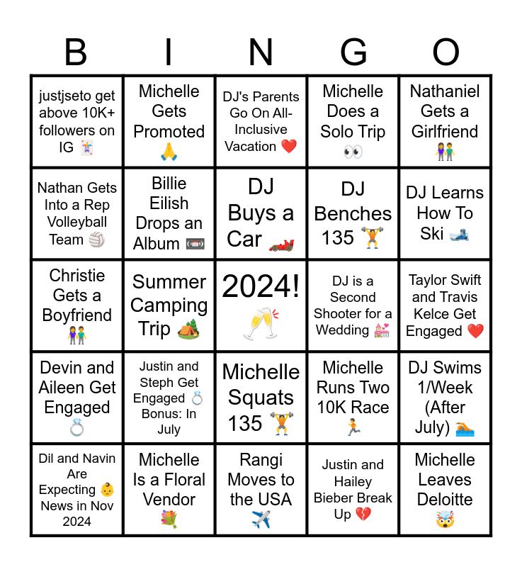 This bingo card has a free space and 24 words: Justin and Steph Get Engaged 💍 Bonus: In July, Michelle Is a Floral Vendor 💐, DJ Buys a Car 🏎️, Dil and Navin Are Expecting 👶 News in Nov 2024, Nathaniel Gets a Girlfriend 👫, justjseto get above 10K+ followers on IG 🃏, Nathan Gets Into a Rep Volleyball Team 🏐, Michelle Gets Promoted 🙏, DJ is a Second Shooter for a Wedding 💒, Michelle Squats 135 🏋️, DJ Benches 135 🏋️, Christie Gets a Boyfriend 👫, Michelle Runs Two 10K Race 🏃, DJ Swims 1/Week (After July) 🏊🏾, Billie Eilish Drops an Album 📼, Justin and Hailey Bieber Break Up 💔, Taylor Swift and Travis Kelce Get Engaged ❤️, DJ's Parents Go On All-Inclusive Vacation ❤️, DJ Learns How To Ski 🎿, Summer Camping Trip 🏕️, Michelle Leaves Deloitte 🤯, Devin and Aileen Get Engaged 💍, Michelle Does a Solo Trip 👀 and Rangi Moves to the USA ✈️.
