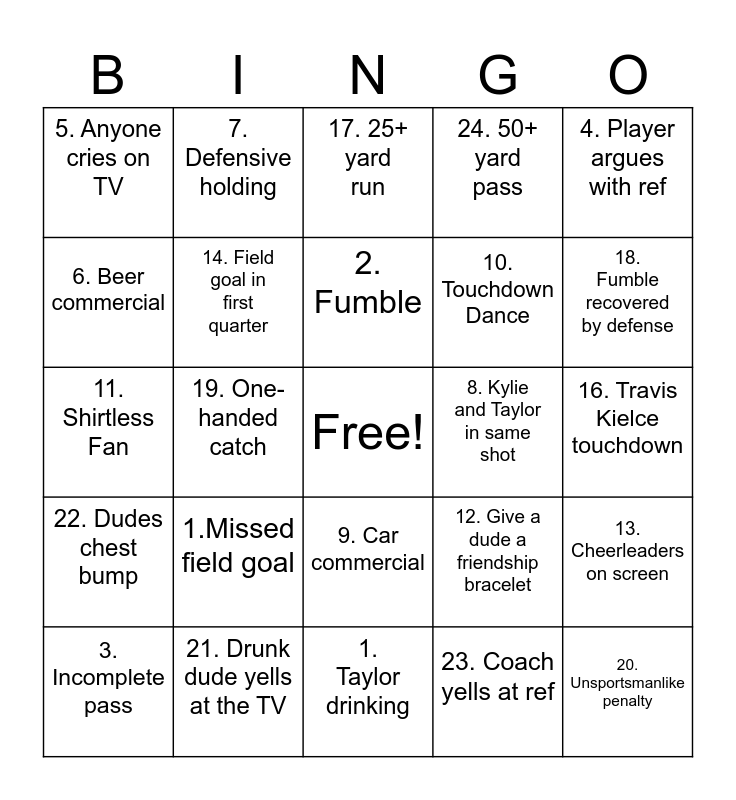 This bingo card has a free space and 25 words: 1.Missed field goal, 1. Taylor drinking, 2. Fumble, 3. Incomplete pass, 4. Player argues with ref, 5. Anyone cries on TV, 6. Beer commercial, 7. Defensive holding, 8. Kylie and Taylor in same shot, 9. Car commercial, 10. Touchdown Dance, 11. Shirtless Fan, 12. Give a dude a friendship bracelet, 13. Cheerleaders on screen, 14. Field goal in first quarter, 15. More than 14 point lead in any quarter, 16. Travis Kielce touchdown, 17. 25+ yard run, 18. Fumble recovered by defense, 19. One-handed catch, 20. Unsportsmanlike penalty, 21. Drunk dude yells at the TV, 22. Dudes chest bump, 24. 50+ yard pass and 23. Coach yells at ref.