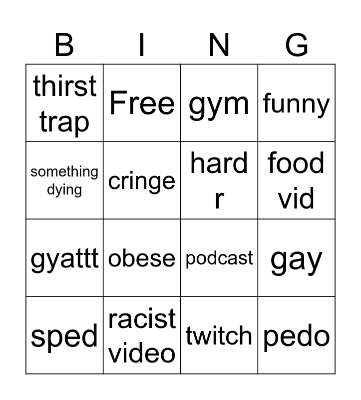 This bingo card has 16 words: racist video, gay, gym, thirst trap, gyattt, Free, podcast, twitch, something dying, cringe, sped, funny, obese, food vid, hard r and pedo.