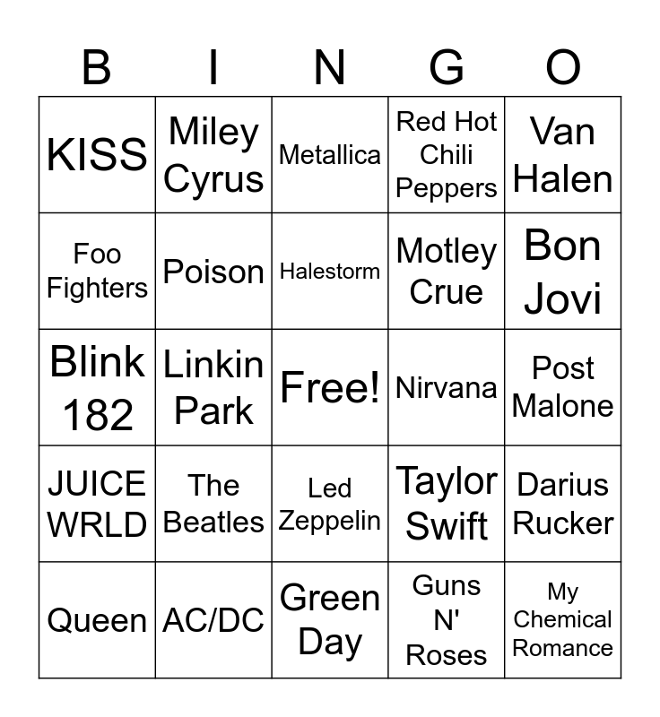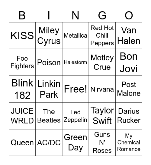 This bingo card has a free space and 31 words: Green Day, Pearl Jam, Linkin Park, 21 Savage, KISS, Metallica, Poison, Taylor Swift, Nirvana, Guns N' Roses, Post Malone, My Chemical Romance, Elvis, Twisted Sisters, Bon Jovi, Maroon 5, Darius Rucker, The Beatles, JUICE WRLD, Led Zeppelin, Van Halen, Eminem, Queen, Miley Cyrus, Motley Crue, Foo Fighters, Red Hot Chili Peppers, Blink 182, AC/DC, Halestorm and Rae Sremmurd.