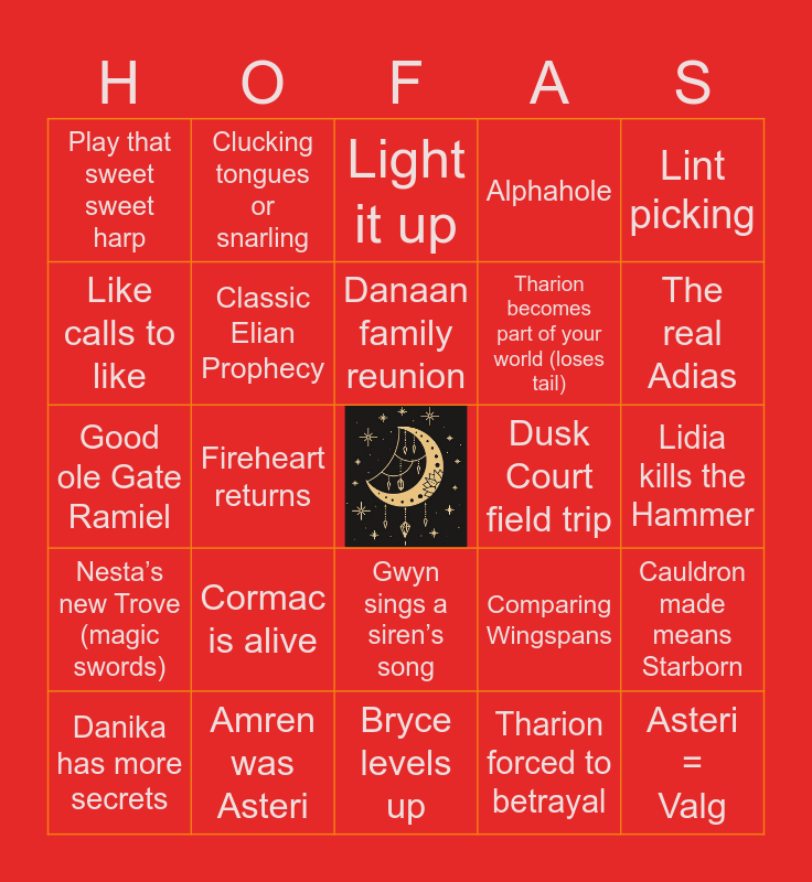 This bingo card has a free space and 24 words: Danika has more secrets, Cormac is alive, Danaan family reunion, Tharion forced to betrayal, Lint picking, Play that sweet sweet harp, Clucking tongues or snarling, Light it up, Dusk Court field trip, Lidia kills the Hammer, Good ole Gate Ramiel, Classic Elian Prophecy, Comparing Wingspans, Cauldron made means Starborn, Like calls to like, Amren was Asteri, Bryce levels up, Alphahole, The real Adias, Nesta’s new Trove (magic swords), Fireheart returns, Gwyn sings a siren’s song, Tharion becomes part of your world (loses tail) and Asteri = Valg.