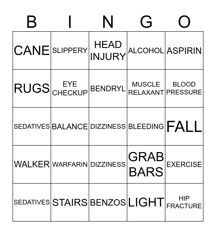 This bingo card has 25 words: WARFARIN, BENZOS, BENDRYL, SEDATIVES, ASPIRIN, CANE, RUGS, SLIPPERY, BLEEDING, DIZZINESS, MUSCLE RELAXANT, SEDATIVES, GRAB BARS, EXERCISE, EYE CHECKUP, HIP FRACTURE, FALL, HEAD INJURY, BLOOD PRESSURE, BALANCE, DIZZINESS, STAIRS, WALKER, ALCOHOL and LIGHT.