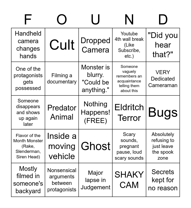 This bingo card has a free space and 24 words: Inside a moving vehicle, Nonsensical arguments between protagonists, Monster is blurry. "Could be anything.", Mostly filmed in someone's backyard, "Did you hear that?", Handheld camera changes hands, One of the protagonists gets possessed, Cult, Eldritch Terror, Ghost, Someone vaguely remembers an acquaintance telling them about this, Someone disappears and shows up again later, Scary sounds, pregnant pause, loud scary sounds, Absolutely refusing to just leave the spook zone, Filming a documentary, SHAKY CAM, Bugs, Dropped Camera, VERY Dedicated Cameraman, Predator Animal, Secrets kept for no reason, Flavor of the Month Monster (Rake, Slenderman, Siren Head), Youtube 4th wall break (Like Subscribe, etc.) and Major lapse in Judgement.