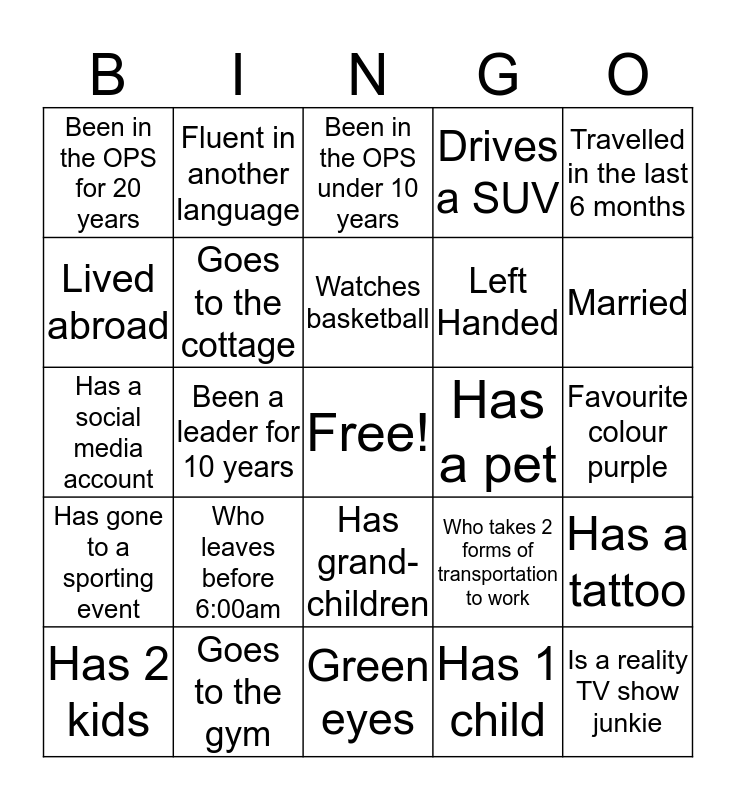 This bingo card has a free space and 24 words: Who leaves before 6:00am, Goes to the gym, Watches basketball, Has 2 kids, Travelled in the last 6 months, Been in the OPS for 20 years, Lived abroad, Fluent in another language, Has a pet, Has grand-children, Left Handed, Has a social media account, Who takes 2 forms of transportation to work, Has a tattoo, Goes to the cottage, Has 1 child, Favourite colour purple, Been in the OPS under 10 years, Married, Been a leader for 10 years, Is a reality TV show junkie, Has gone to a sporting event, Drives a SUV and Green eyes.