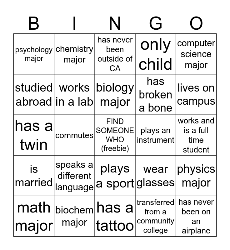 This bingo card has a free space and 24 words: speaks a different language, biochem major, biology major, math major, computer science major, psychology major, studied abroad, chemistry major, plays an instrument, plays a sport, has broken a bone, has a twin, wear glasses, physics major, works in a lab, transferred from a community college, works and is a full time student, has never been outside of CA, lives on campus, commutes, has never been on an airplane, is married, only child and has a tattoo.