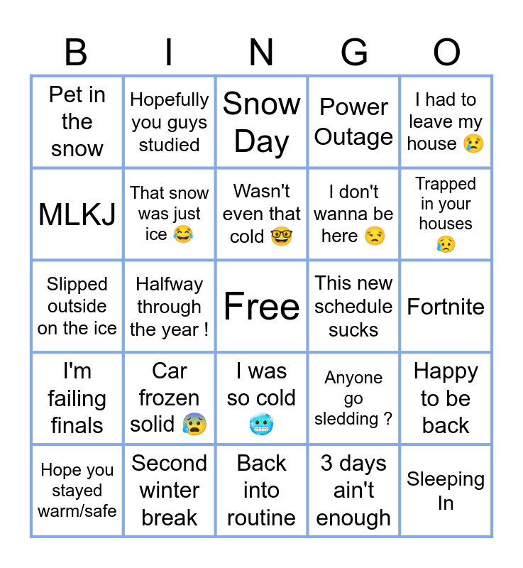 This bingo card has a free space and 28 words: Happy to be back, Me & my s/o, I don't wanna be here 😒, 3 days ain't enough, MLKJ, Snow Day, Hopefully you guys studied, I'm failing finals, This new schedule sucks, Hope you stayed warm/safe, Slipped outside on the ice, Power Outage, Second winter break, Back into routine, Trapped in your houses 😥, Fallen Tree, Car frozen solid 😰, That snow was just ice 😂, Wasn't even that cold 🤓, I was so cold 🥶, Pet in the snow, My boss got mad, Sleeping In, Halfway through the year !, Fortnite, Anyone go sledding ?, I had to leave my house 😢 and Cold Shower.