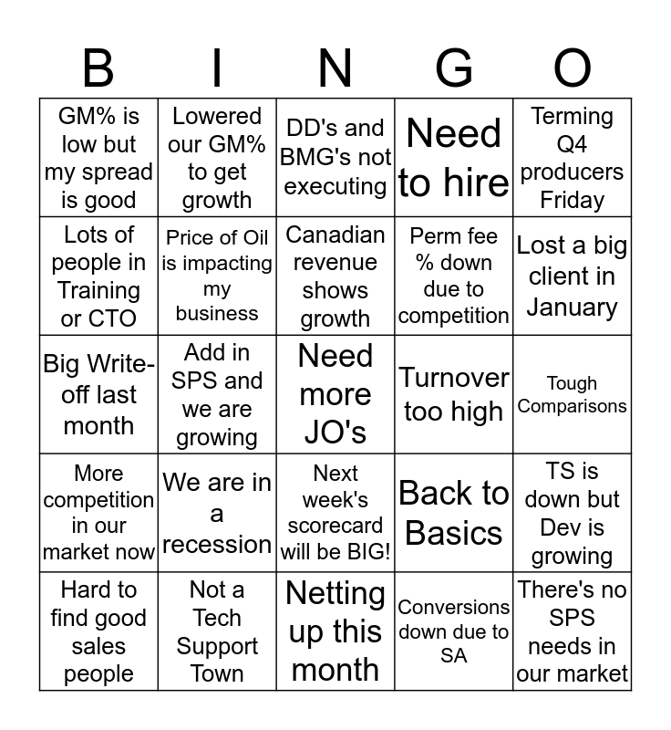 This bingo card has 25 words: We are in a recession, Netting up this month, Canadian revenue shows growth, Hard to find good sales people, Terming Q4 producers Friday, GM% is low but my spread is good, Lots of people in Training or CTO, Lowered our GM% to get growth, Turnover too high, Next week's scorecard will be BIG!, Perm fee % down due to competition, Big Write-off last month, Back to Basics, TS is down but Dev is growing, Price of Oil is impacting my business, There's no SPS needs in our market, Tough Comparisons, DD's and BMG's not executing, Lost a big client in January, Add in SPS and we are growing, Need more JO's, Not a Tech Support Town, More competition in our market now, Need to hire and Conversions down due to SA.