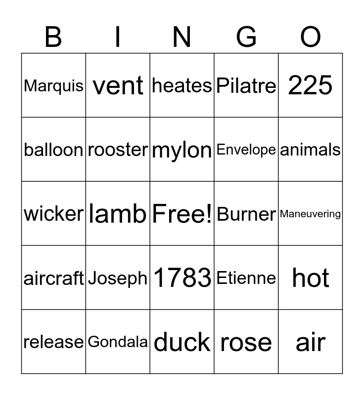 This bingo card has a free space and 24 words: Joseph, Gondala, mylon, release, 225, Marquis, balloon, vent, Burner, 1783, Envelope, wicker, Etienne, hot, rooster, rose, Maneuvering, heates, animals, lamb, air, aircraft, Pilatre and duck.