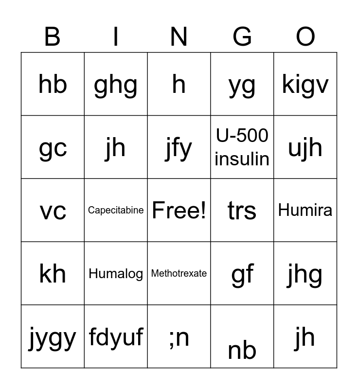 This bingo card has a free space and 24 words: Humalog, fdyuf, jfy, jygy, kigv, hb, gc, ghg, trs, Methotrexate, U-500 insulin, vc, gf, jhg, jh, nb, Humira, h, ujh, Capecitabine, jh, kh, yg and ;n.