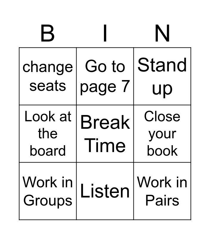 This bingo card has a free space and 11 words: Repeat, Listen, Work in Pairs, Work in Groups, Go to page 7, Stand up, Close your book, Sit down, Look at the board, change seats and Raise your hand.