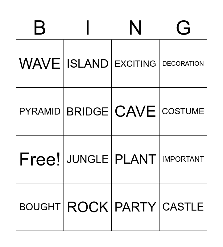 This bingo card has 20 words: IMPORTANT, POPULAR, EXCITING, DANGEROUS, BOUGHT, PYRAMID, ROCK, WAVE, Free!, ISLAND, JUNGLE, PLANT, BRIDGE, CASTLE, CAVE, DESERT, COSTUME, DECORATION, PARTY and GAMES.