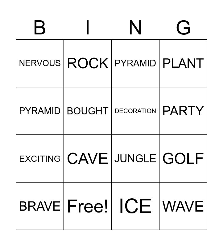 This bingo card has 28 words: IMPORTANT, POPULAR, EXCITING, DANGEROUS, BOUGHT, PYRAMID, ROCK, WAVE, Free!, ISLAND, JUNGLE, PLANT, BRIDGE, CASTLE, CAVE, DESERT, COSTUME, DECORATION, PARTY, GAMES, NERVOUS, TIRED, BRAVE, GOLF, ICE, ISLAND, PYRAMID and GAMES.