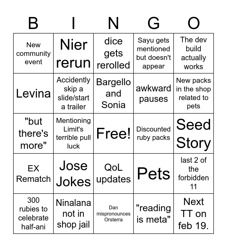 This bingo card has a free space and 24 words: Jose Jokes, Ninalana not in shop jail, Bargello and Sonia, 300 rubies to celebrate half-ani, The dev build actually works, New community event, Levina, Nier rerun, Discounted ruby packs, QoL updates, awkward pauses, "but there's more", Pets, last 2 of the forbidden 11, Accidently skip a slide/start a trailer, "reading is meta", Seed Story, dice gets rerolled, New packs in the shop related to pets, Mentioning Limit's terrible pull luck, Next TT on feb 19., EX Rematch, Sayu gets mentioned but doesn't appear and Dan mispronounces Orsterra.