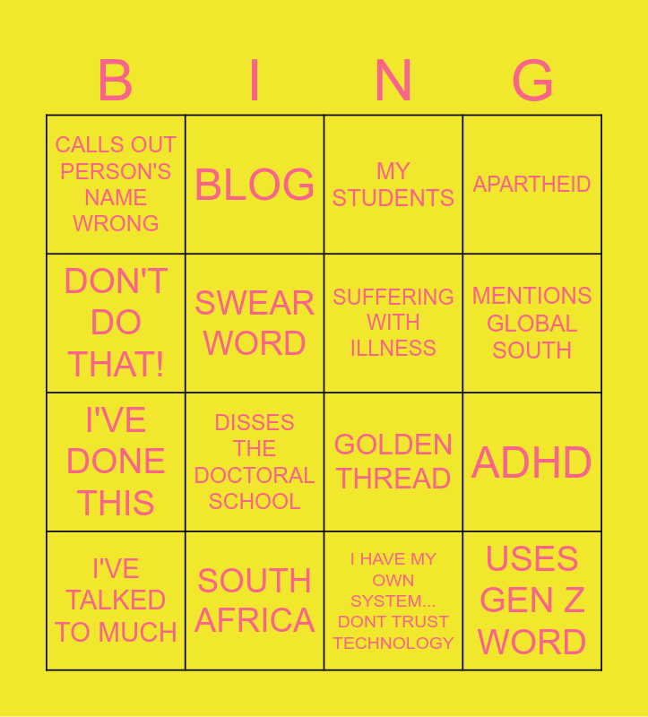 This bingo card has 16 words: SOUTH AFRICA, ADHD, MY STUDENTS, CALLS OUT PERSON'S NAME WRONG, I'VE DONE THIS, BLOG, GOLDEN THREAD, I HAVE MY OWN SYSTEM... DONT TRUST TECHNOLOGY, DON'T DO THAT!, SWEAR WORD, I'VE TALKED TO MUCH, APARTHEID, DISSES THE DOCTORAL SCHOOL, MENTIONS GLOBAL SOUTH, SUFFERING WITH ILLNESS and USES GEN Z WORD.
