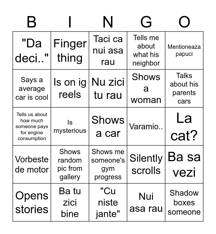 This bingo card has a free space and 27 words: Ala ii fain, Ba tu zici bine, Nu zici tu rau, Nui asa rau, Mentioneaza papuci, Says a average car is cool, Finger thing, "Cu niste jante", Varamio.., Ba sa vezi, Vorbeste de motor, Is on ig reels, Silently scrolls, Shadow boxes someone, Tells us about how much someone pays for engine consumption, "taci ca si a luat masina", Taci ca nui asa rau, Tells me about what his neighbor, La cat?, "Da deci..", Shows random pic from gallery, Shows me someone's gym progress, Shows a woman, Talks about his parents cars, Opens stories, Is mysterious and Roasts cars.