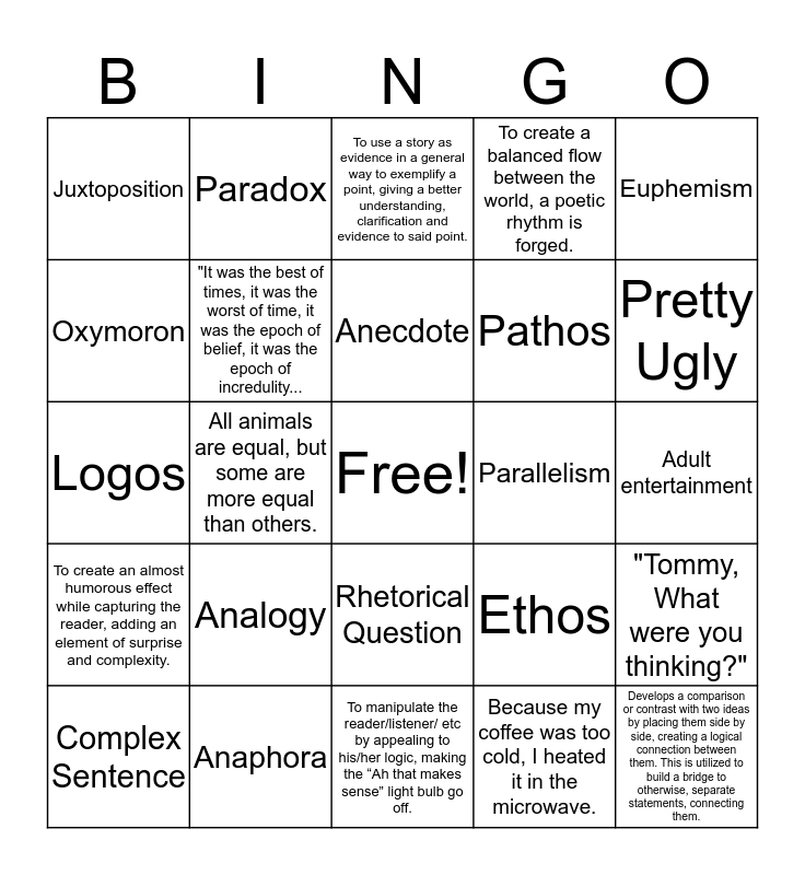 This bingo card has a free space and 24 words: Analogy, Anaphora, Anecdote, Complex Sentence, Euphemism, Juxtoposition, Oxymoron, Paradox, Parallelism, Rhetorical Question, Pathos, Logos, Ethos, "Tommy, What were you thinking?", "It was the best of times, it was the worst of time, it was the epoch of belief, it was the epoch of incredulity..., Because my coffee was too cold, I heated it in the microwave., Adult entertainment, To use a story as evidence in a general way to exemplify a point, giving a better understanding, clarification and evidence to said point., Pretty Ugly, All animals are equal, but some are more equal than others., Develops a comparison or contrast with two ideas by placing them side by side, creating a logical connection between them. This is utilized to build a bridge to otherwise, separate statements, connecting them., To create an almost humorous effect while capturing the reader, adding an element of surprise and complexity., To create a balanced flow between the world, a poetic rhythm is forged. and To manipulate the reader/listener/ etc by appealing to his/her logic, making the “Ah that makes sense” light bulb go off..