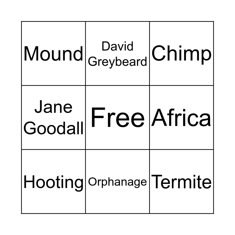 This bingo card has a free space and 8 words: Africa, Chimp, David Greybeard, Hooting, Mound, Termite, Jane Goodall and Orphanage.