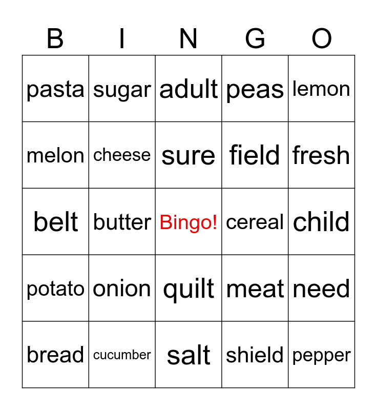 This bingo card has a free space and 24 words: onion, cucumber, sure, bread, lemon, pasta, melon, sugar, cereal, quilt, field, belt, meat, need, cheese, shield, child, adult, fresh, butter, pepper, potato, peas and salt.