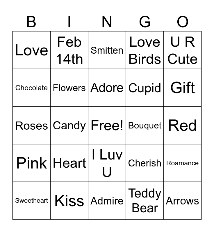 This bingo card has a free space and 24 words: Heart, Kiss, Adore, Sweetheart, U R Cute, Love, Chocolate, Feb 14th, Bouquet, I Luv U, Cupid, Roses, Cherish, Roamance, Flowers, Teddy Bear, Red, Smitten, Gift, Candy, Arrows, Pink, Love Birds and Admire.