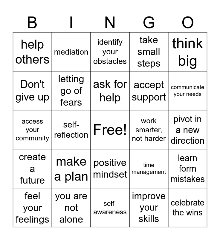 This bingo card has a free space and 24 words: make a plan, you are not alone, ask for help, feel your feelings, think big, help others, Don't give up, mediation, work smarter, not harder, positive mindset, accept support, access your community, time management, learn form mistakes, letting go of fears, improve your skills, pivot in a new direction, identify your obstacles, communicate your needs, self-reflection, celebrate the wins, create a future, take small steps and self-awareness.