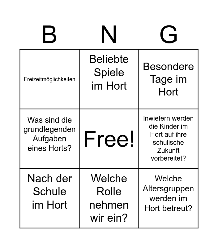 This bingo card has a free space and 8 words: Inwiefern werden die Kinder im Hort auf ihre schulische Zukunft vorbereitet?, Besondere Tage im Hort, Beliebte Spiele im Hort, Nach der Schule im Hort, Freizeitmöglichkeiten, Welche Altersgruppen werden im Hort betreut?, Was sind die grundlegenden Aufgaben eines Horts? and Welche Rolle nehmen wir ein?.