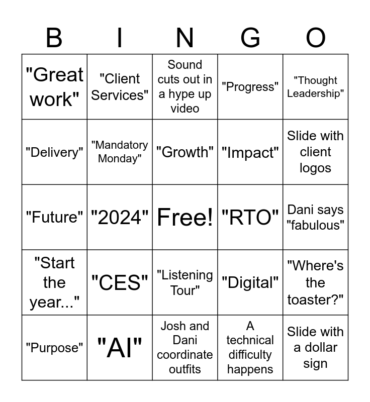 This bingo card has a free space and 24 words: "CES", "AI", "Growth", "Purpose", "Thought Leadership", "Great work", "Delivery", "Client Services", "RTO", "Listening Tour", "Impact", "Future", "Digital", "Where's the toaster?", "Mandatory Monday", A technical difficulty happens, Dani says "fabulous", Sound cuts out in a hype up video, Slide with client logos, "2024", Slide with a dollar sign, "Start the year...", "Progress" and Josh and Dani coordinate outfits.