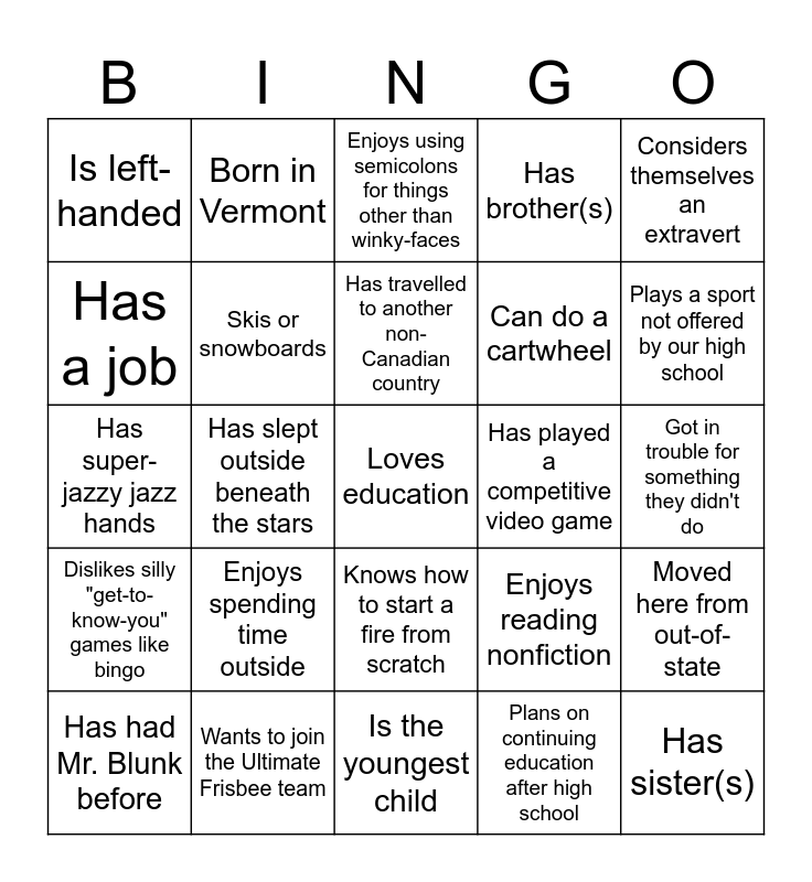 This bingo card has a free space and 29 words: Has had Mr. Blunk before, Read a book this year, Has slept outside beneath the stars, Has a twin, Is left-handed, Enjoys using semicolons for things other than winky-faces, Skis or snowboards, Enjoys spending time outside, Has played a competitive video game, Wants to join the Ultimate Frisbee team, Got in trouble for something they didn't do, Has sister(s), Is the youngest child, Plans on continuing education after high school, Plays a sport not offered by our high school, Writes in their free time, Knows how to start a fire from scratch, Dislikes silly "get-to-know-you" games like bingo, Considers themselves an extravert, Has super-jazzy jazz hands, Enjoys reading nonfiction, Considers themselves spiritual and/or religious, Can do a cartwheel, Has a job, Has brother(s), Born in Vermont, Moved here from out-of-state, Has travelled to another non-Canadian country and Has travelled to a Canadian country.