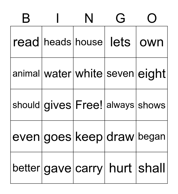 This bingo card has a free space and 29 words: another, gave, house, over, own, read, water, white, always, began, better, gives, hurt, shall, should, things, carry, draw, eight, even, goes, may, seven, shows, animal, heads, keep, lets and point.