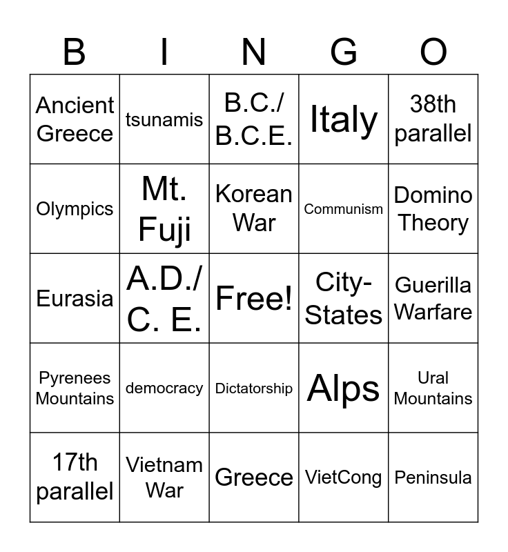 This bingo card has a free space and 24 words: democracy, Vietnam War, Korean War, 17th parallel, 38th parallel, Ancient Greece, Olympics, tsunamis, City-States, Dictatorship, Communism, Eurasia, Alps, Ural Mountains, Mt. Fuji, VietCong, Guerilla Warfare, B.C./ B.C.E., Domino Theory, A.D./ C. E., Peninsula, Pyrenees Mountains, Italy and Greece.