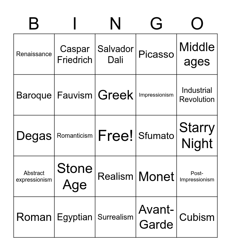 This bingo card has a free space and 24 words: Stone Age, Egyptian, Greek, Roman, Middle ages, Renaissance, Baroque, Caspar Friedrich, Sfumato, Realism, Impressionism, Degas, Monet, Post-Impressionism, Fauvism, Avant-Garde, Starry Night, Salvador Dali, Industrial Revolution, Romanticism, Cubism, Abstract expressionism, Picasso and Surrealism.