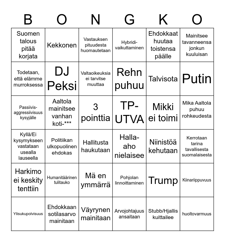 This bingo card has 36 words: Pohjolan linnoittaminen, Mä en ymmärrä, Arvojohtajuus ansaitaan, Todetaan, että elämme murroksessa, Kyllä/Ei kysymykseen vastataan usealla lauseella, TP-UTVA, DJ Peksi, Väyrynen mainitaan, Ehdokkaat huutaa toistensa päälle, Trump, Putin, Hybridi-vaikuttaminen, Kiinariippuvuus, Aaltola mainitsee vanhan koti-***, Rehn puhuu, Suomen talous pitää korjata, Harkimo ei keskity tenttiin, Mikki ei toimi, Passiivis-aggressiivisuus kysyjälle, Vastauksen pituudesta huomautetaan, 3 pointtia, Politiikan ulkopuolinen ehdokas, Halla-aho nielaisee, Hallitusta haukutaan, Niinistöä kehutaan, Kekkonen, Talvisota, Ehdokkaan sotilasarvo mainitaan, Valtaoikeuksia ei tarvitse muuttaa, Mainitsee tavanneensa jonkun kuuluisan, huoltovarmuus, Ylisukupolvisuus, Kerrotaan tarina tavallisesta suomalaisesta, Mika Aaltola puhuu rohkeudesta, Humanitäärinen tulitauko and Stubb/Hjallis kuittailee.