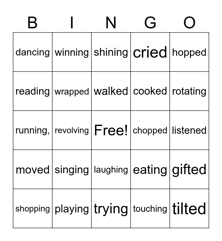 This bingo card has a free space and 24 words: singing, playing, walked, shopping, hopped, dancing, reading, winning, chopped, laughing, cooked, running,, eating, gifted, wrapped, touching, listened, shining, rotating, revolving, tilted, moved, cried and trying.