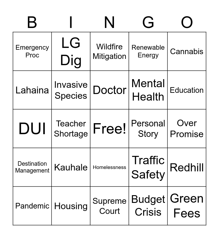 This bingo card has a free space and 24 words: Kauhale, Housing, Doctor, Pandemic, Cannabis, Emergency Proc, Lahaina, LG Dig, Personal Story, Homelessness, Mental Health, DUI, Traffic Safety, Redhill, Invasive Species, Budget Crisis, Over Promise, Wildfire Mitigation, Education, Teacher Shortage, Green Fees, Destination Management, Renewable Energy and Supreme Court.