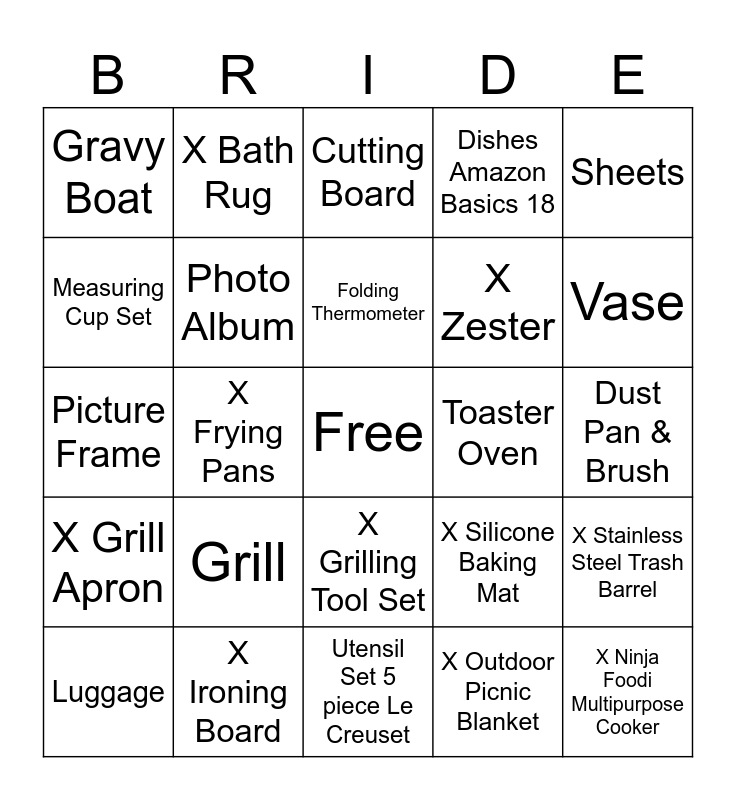 This bingo card has a free space and 81 words: Wicker Storage Bin, Oil Bottle, Cutting Board, Holiday Decorations, Deep Sauce Dish (4), Comforter, Microwave, Baking Set (10), Mixing Bowls, Silverware, Drinking Glasses, Knife Set, Dishes Amazon Basics 18, Gravy Boat, Bakeware Lid, Measuring Cup Set, Vaccum, Grill, Utensil Tray, Dust Pan & Brush, Chip Clips, Sheets, Picture Frame, Folding Thermometer, Photo Album, Candle, Lingerie, Hand Made Gift, Ninja Foodi Smoothie, Air Matress, Vase, Coffee Mug(s), Utensil Set 5 piece Le Creuset, Boho Harper Hand Towel Set, Luggage, Toaster Oven, Ninja Food Processor, Cotton Rope Baskets, Set of 2, X Photo Album, Hand Towel, Set of 2, X Ninja Foodi Multipurpose Cooker, X Coffee Maker, X Rubbermaid Food Storage Containers, X Fresh and Save Vacuum Bags, X Frying Pans, X Skillet, X Bath Rug, Cooler, X Roasting Pan, X Lazy Susan, X Silicone Baking Mat, X Stainless Steel Trash Barrel, X Lamp, Dish Drainer Rack, X Steam Mop, X Pots and Pan Set, X Cast Iron Frying Pan, X Springform Pan, X Pie Dish, Ramekins, X Grilling Tool Set, X Salt and Pepper Mill, X Kitchen Scale, Can Opener, X Popcorn Maker, X Serving Platter, X Serving Bowl, X Cheese Knife Set, X Trivet, Cake Stand, Bath Towels, X Grill Apron, X Ironing Board, X Travel Iron, X Toilet Plunger, X TV, X Electric Griddle, X Outdoor Picnic Blanket, X Laundry Rack, X Zester and X Meat Tenderizer.