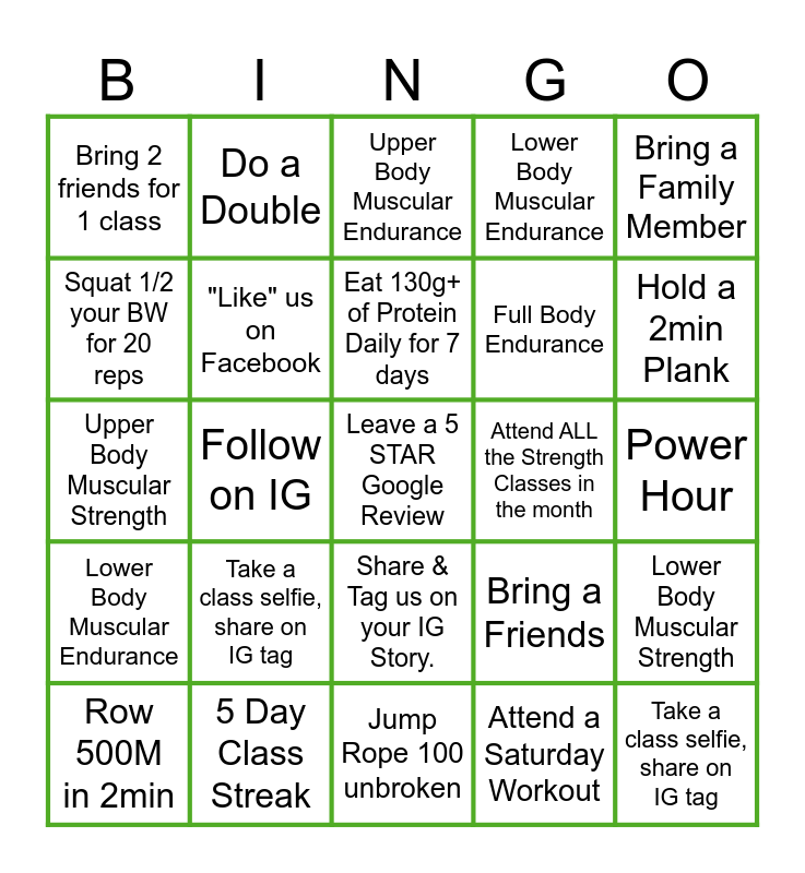 This bingo card has a free space and 32 words: Attend a Saturday Workout, Follow ALL the coaches on IG, Follow on IG, 2 Unassisted Chin-ups or 60-sec Deadhang, Lower Body Muscular Endurance, "Like" us on Facebook, Bring a Family Member, Lower Body Muscular Strength, Do a Double, Take a Morning Class, Eat 130g+ of Protein Daily for 7 days, Upper Body Muscular Endurance, Take an Evening Class, Hold a 2min Wallsit, Attend ALL the Strength Classes in the month, Bring a Friend, Row 500M in 2min, Upper Body Muscular Strength, Share & Tag us on your IG Story., Take a class selfie, share on IG tag, Bring a Friends, Full Body Endurance, Power Hour, 5 Day Class Streak, Take a class selfie, share on IG tag, Lower Body Muscular Endurance, Full Body Endurance, Squat 1/2 your BW for 20 reps, Bring 2 friends for 1 class, Jump Rope 100 unbroken, Attend 15 classes in the month and Hold a 2min Plank.